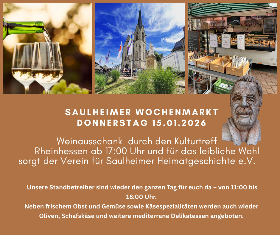 Am 15. Januar ab 11:00 Uhr öffnet der Saulheimer Wochenmarkt wieder seine Stände. Neben frischem Obst und Gemüse sowie Käsespezialitäten werden auch wieder Oliven, Schafskäse und weitere mediterrane Delikatessen angeboten.