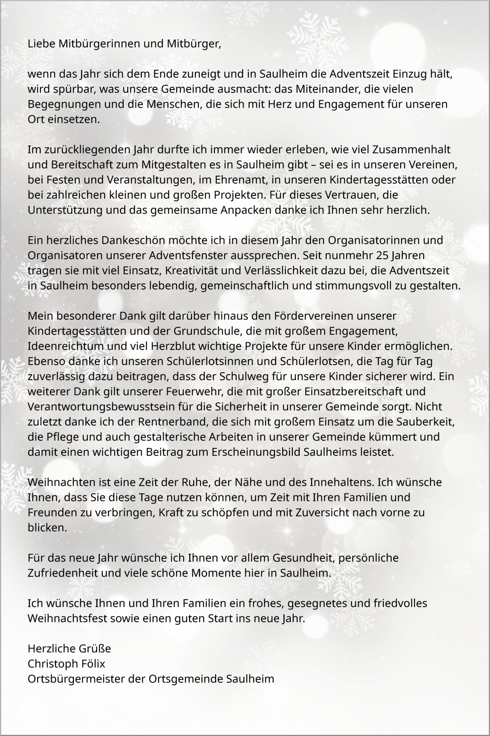 Der Ober-Saulheimer Weihnachtsmarkt „Winterzauber“ liegt nun hinter uns, und wir haben inzwischen schon den zweiten Advent gefeiert. Gerade deshalb möchte ich mich noch einmal herzlich bei allen bedanken, die diesen schönen und stimmungsvollen Markt möglich gemacht haben.