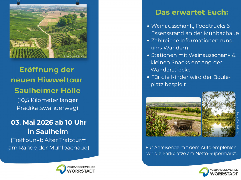 Liebe Saulheimerinnen, liebe Saulheimer, bitte beachten Sie, dass am Donnerstag, den 30. April 2026, aufgrund des Betriebsausfluges der Ortsgemeinde Saulheim alle kommunalen Einrichtungen geschlossen bleiben. Dies betrifft die fünf kommunalen Kindertagesstätten, das Rathaus sowie den örtlichen Bauhof. Ab Montag, den 4. Mai 2026, stehen Ihnen die Einrichtungen wieder zu den gewohnten Zeiten zur Verfügung.