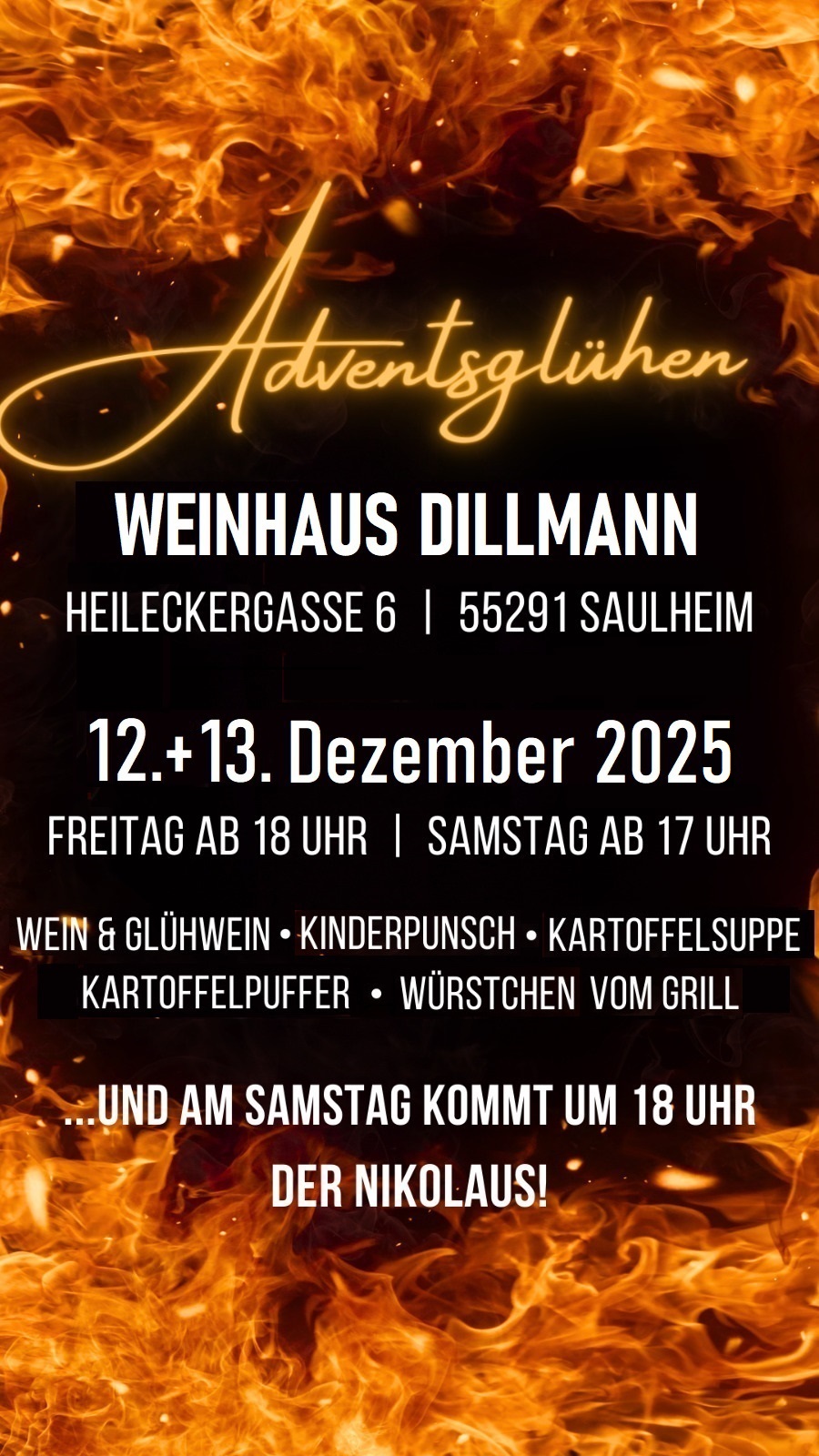 Glühweinabend im Weinhaus Dillmann mit Würstchen vom Grill, Kartoffelsuppe, Kartoffelpuffer mit Apfelmus u. a.