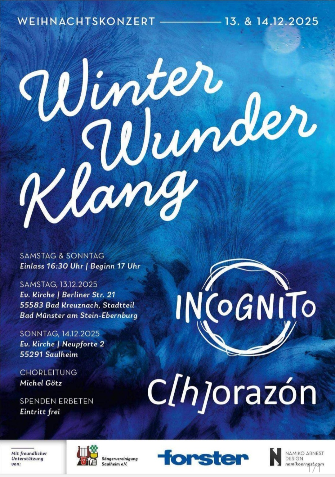 Die Tage werden kürzer und die Vorweihnachtszeit nähert sich. Inmitten aller Vorbereitungen und Termine sollen aber auch Momente der Ruhe und Entschleunigung nicht zu kurz kommen. Diese Momente möchten Ihnen der Frauenchor „INCOGNITO“ und das Vokalensemble „C[h]orazón“ in ihren diesjährigen Weihnachtskonzerten bieten und Sie musikalisch auf diese besondere Zeit einstimmen. Wir laden Sie am 13. Dezember 2025 in die evangelische Kirche in Bad Münster am Stein und / oder am 14. Dezember 2025 in die evangelische Kirche Nieder-Saulheim ein. Freuen Sie sich auf facettenreiche Klänge zum Advent – von beschwingt bis besinnlich, von modern bis klassisch. Wir freuen uns über zahlreiche Gäste. Beginn ist jeweils um 17.00 Uhr, Einlass jeweils eine halbe Stunde früher. Der Eintritt ist frei; um Spenden wird gebeten.