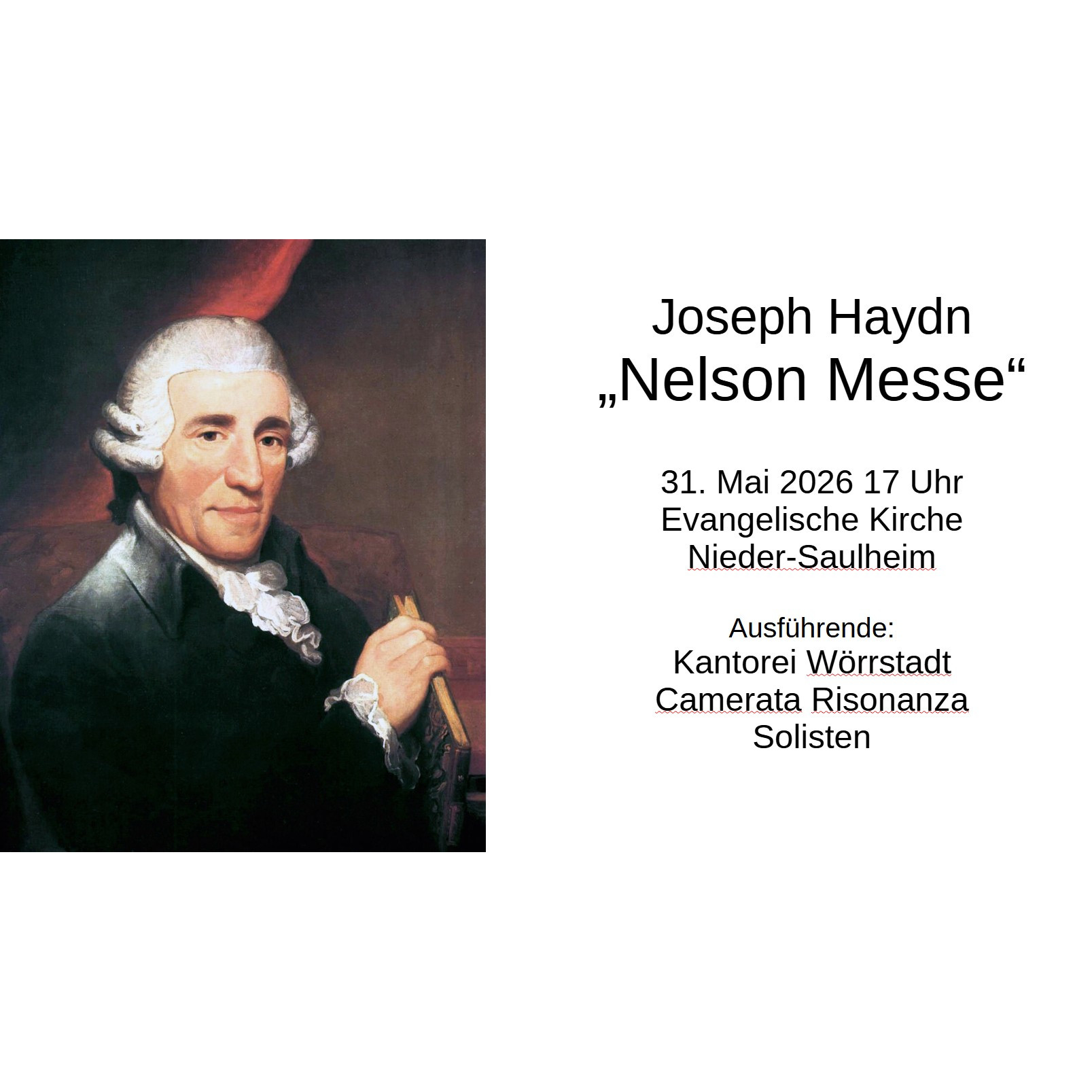 Joseph Haydns „Nelson Messe“, offiziell Missa in angustiis („Messe in bedrängter Zeit“), entstand 1798 vor dem historischen Hintergrund politischer Unsicherheit in Europa. Die Wörrstädter Kantorei und das Orchester Camerata Risonanza und Gesangssolisten führen dieses großartige Werk auf