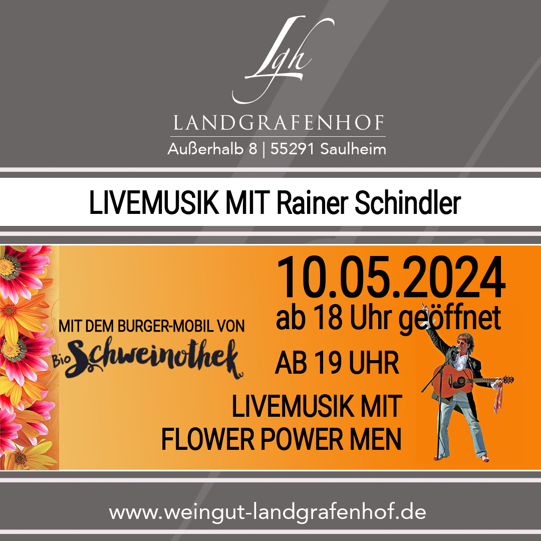 Ab 19 Uhr Livemusik mit dem Flower Power Men – Rainer Schindler. An diesem Tag mit Leckereien von dem Burger-Mobil der Bio Schweinothek und wie immer mit Landgrafenhof Wein.