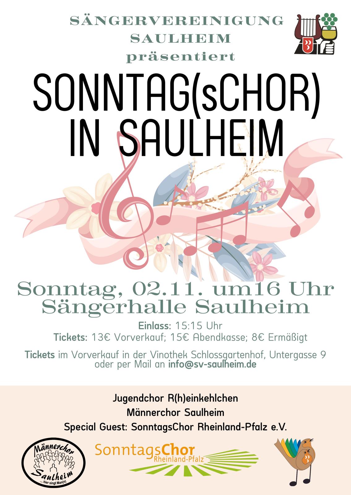 Besondere Gesangsdarbietungen und hochklassigen Chorgesang verspricht der renommierte und im Land bestens bekannte SonntagsChor Rheinland-Pfalz unter der Leitung von Johannes Kalpers. 35 Sängerinnen und Sänger aus allen Regionen unseres Bundeslandes freuen sich auf den Auftritt im sangesfreudigen Saulheim. Der Chor versteht sich als chormusikalischer Botschafter und ist mit der chormusikalischen Kultur unseres Bundeslandes eng verbunden. Viele kennen ihn aus der Zeit mit der SWR-Kinderhilfsaktion “Herzenssache“ und als Konzertpartner der „Initiative Kinderglück“ mit Lotto RLP. Lassen Sie sich überraschen von einem brillant dargebotenen Cross-Over – Repertoire, welches sich auf keine Stilrichtung festlegt und einen lebendigen Querschnitt aller Genres der Chormusik präsentieren wird.