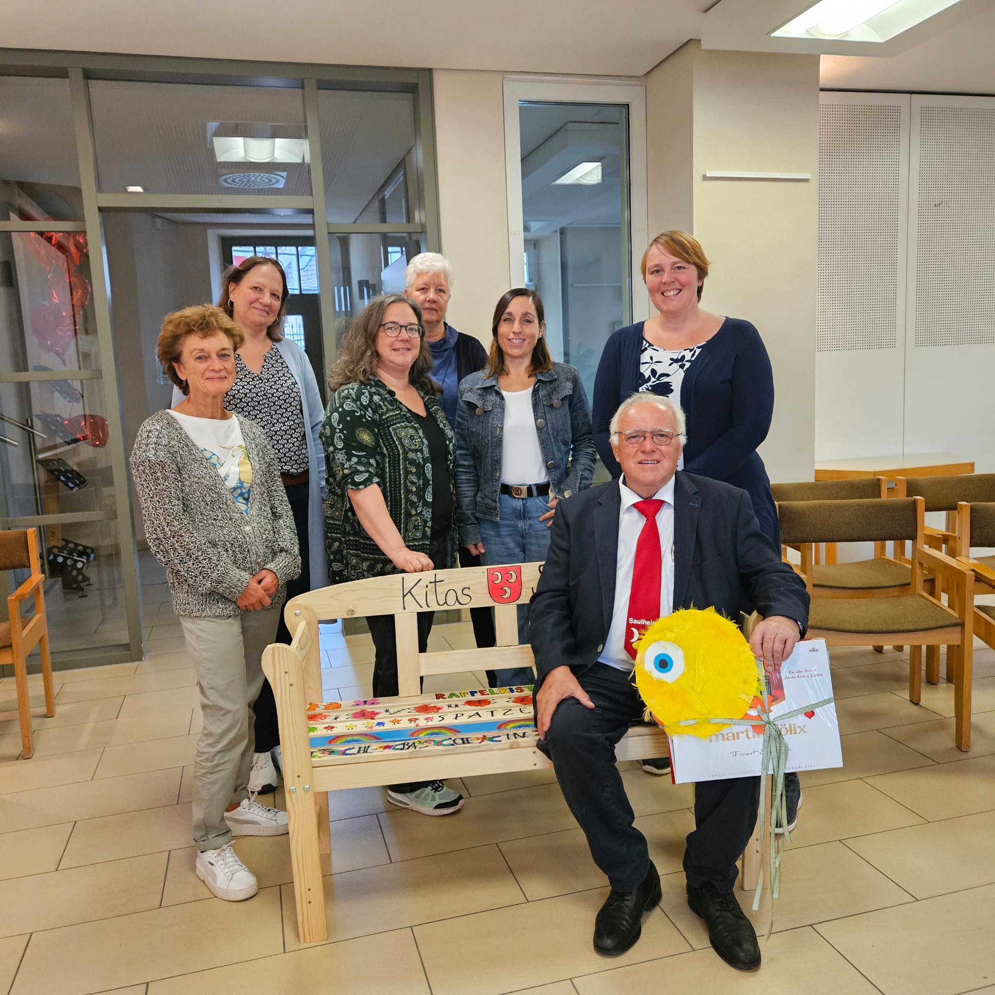 Im Rahmen einer Dienstbesprechung der Kita-Leiterinnen mit der 1. Beigeordneten, Frau Kathrin Oehler, wurde Alt-Bürgermeister Martin Fölix als besonderer Gast eingeladen, um sich für seine langjährige und vertrauensvolle Zusammenarbeit zu bedanken.Im Namen aller Erzieherinnen sprachen die Kita-Leiterinnen Herrn Fölix ihr herzliches Dankeschön für die 15-jährige Zusammenarbeit aus. Von den Kita-Kindern selbst bekam er eine liebevolle Geste in Form eines selbstgebastelten Huhns und einer süßen Aufmerksamkeit. Als Zeichen ihrer Wertschätzung überreichte das Kita-Personal Herrn Fölix eine handgefertigte Ruhebank, die mit den Namen aller fünf Saulheimer Kitas kunstvoll verziert wurde. Diese Bank soll nicht nur als Symbol der Ruhe und Dankbarkeit dienen, sondern auch als Erinnerung an seine jahrelange Unterstützung und den stetigen Einsatz. Zum Abschluss bedankte sich Fölix sichtlich bewegt mit einem Glas alkoholfreien Sekt für die gelungene Überraschung.