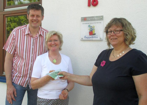 Grosse Freude herrschte vor den Sommerferien in der Kita Rappelkiste. Sabine Schäfer von der Saulheimer Kindersachenaktion überreichte der Leiterin Frau Dörrschuck und dem Vorsitzenden des Fördervereins Herrn von Gerlach 500 Euro aus dem Erlös des Basars.