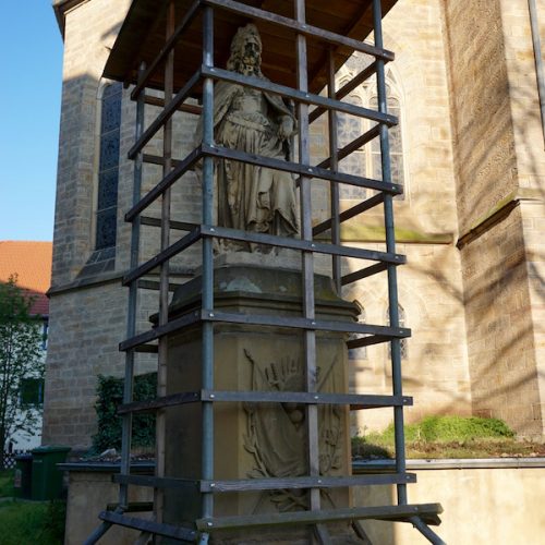 Einst stand das prächtige Denkmal auf dem Platz zwischen dem Rathaus und der kath. Kirche an der Weedengasse. Errichtet wurde es 1875. Nun ist das aus Sand- und Kalkstein gehauene Kulturerbe in die Jahre gekommen und muss restauriert werden.