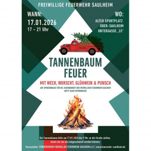 Am 17.01.2026 ab 9 Uhr sammelt die FFW Saulheim die Tannenbäume ein. Diese werden ab 17.00 Uhr auf dem alten Sportplatz in Ober-Saulheim bei einemTannenbaumfeuer verbrannt. Es gibt Weck, Worscht, Glühwein ...