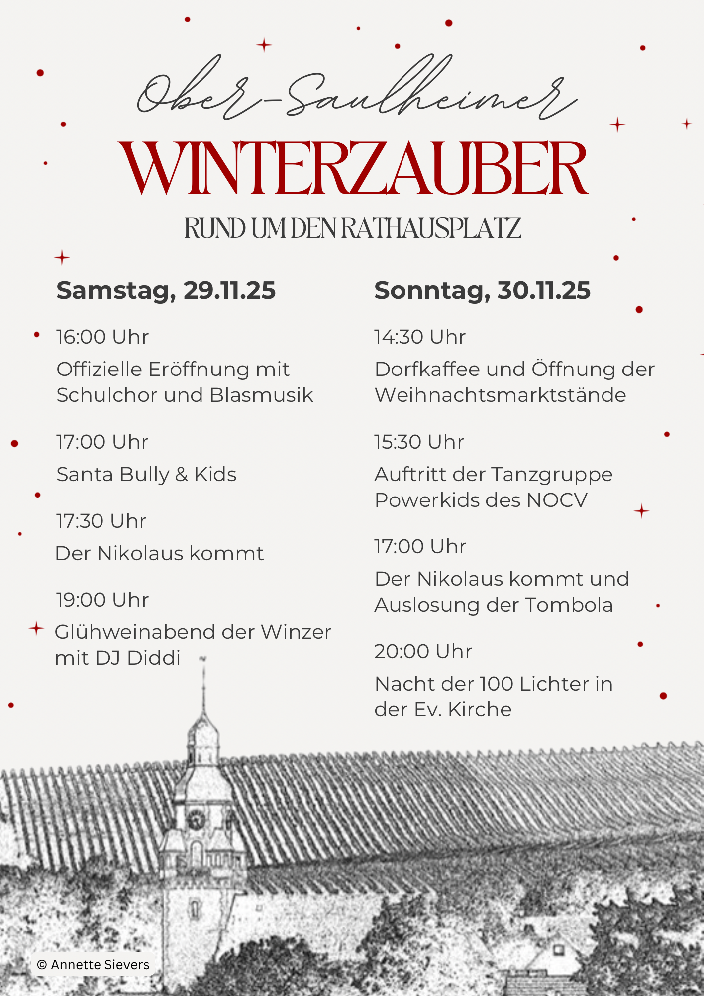 Am Samstag, 29. November, und Sonntag, 30. November 2025 lädt die Ortsgemeinde Saulheim herzlich zum Ober-Saulheimer Weihnachtsmarkt „Winterzauber“ ein. Rund um den Rathausplatz, die Evangelische Kirche und die Untergasse entsteht an diesem Wochenende eine stimmungsvolle Adventskulisse mit festlich geschmückten Ständen, Kunsthandwerk, weihnachtlichen Köstlichkeiten und gemütlichen Treffpunkten.